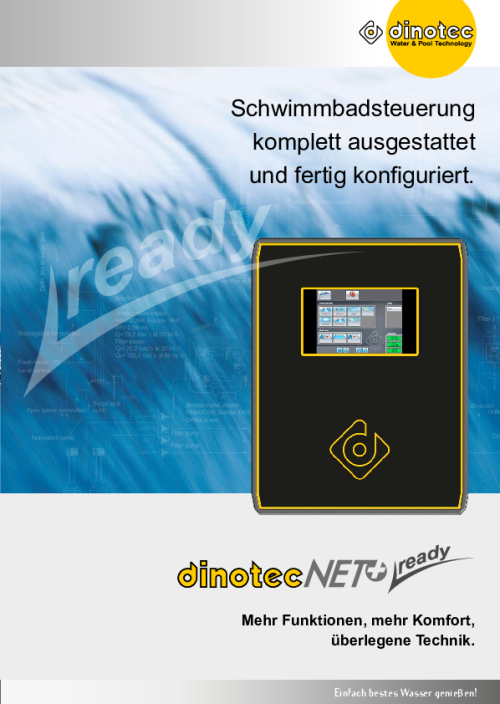 Die neuen dinotecNET+ ready Anlagen sind der bekannten Mess-, Regeltechnikgeneration weit überlegen. Der „kleine Bruder“ des dinotecNET+ Systems übernimmt die Steuerung für ein oder zwei Beckenkreisläufe. Auf einem farbigen Touchscreendisplay werden sämtliche Informationen anschaulich dargestellt. Die Menüführung ist logisch strukturiert, und ermöglicht dadurch einfaches und intuitives Bedienen. Zahlreiche Funktionen sorgen für eine sichere, bedarfsgerechte Wasserpflege und geben die Möglichkeit zur Einsparung von Wasserpflegemittel. Sogar die Wahl der Wasserpflege, ob mit Poolcare (Aktivsauerstoff) oder Chlor lässt das System zu, lediglich die passenden Mess-Sets müssen angeschlossen sein.
