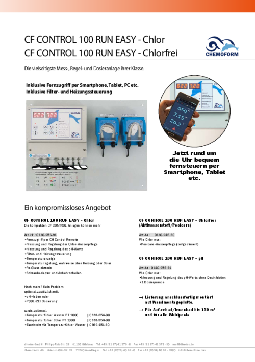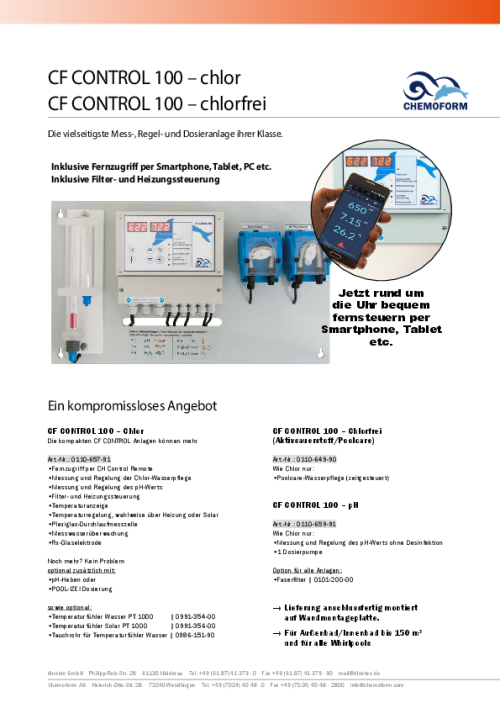 Für die verschleißfreie Redoxelektrode ist keine Kalibrierung notwendig (wartungsfrei). Die CF Control 100 erlaubt je nach Ausführung die Desinfektion mit Chlor oder Poolcare. Die Dosierung erfolgt über dazugehörige externe Pumpen.